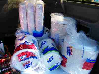 紙皿だけで約3,000枚 以上  コップ…2000個を用意しました。車の後ろから前の座席まで一杯です。写真は後ろに積んだ一部です。