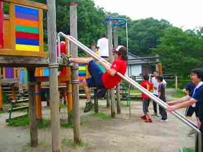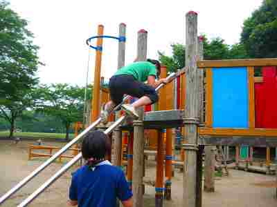 次に斜め平行棒もくせものです。自分の体力、体格に適した色々な登り方、降り方を工夫する頭が必要です。遠○選手は上に乗り、