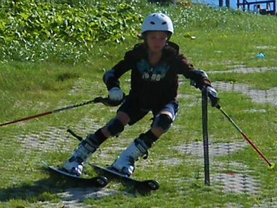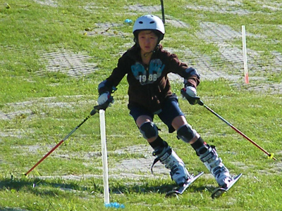アメリカで習った復習が大切とプラスノーでスラローム練習している奈◎選手