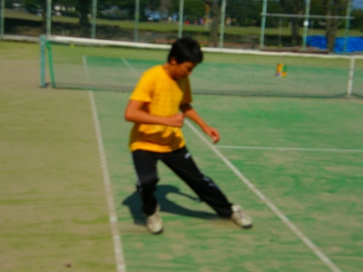 人工芝に砂を撒いたオムにコートは最高のサイドステップの練習場です。オープンスタンスのショットのフォームとスキーのマキシマムフォームと似ていませんか?内足の使い方はテニスの場合、転んでしまうので外足と平行にはなりませんが、アンギュレーション、ヒップローテーションをしないブロック、骨盤のクラッチ、外足荷重、肩のレベル、腕のポジション 等、最高です。