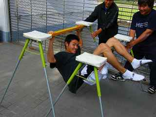 写真1枚目…段違い平行棒では無く、USMRレーシングスクール独自の「勘違い平行棒」で悪戦苦闘している祥○選手