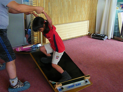 難しい!スーパースライドボードで世界の滑りを学んでいます。膝を絞ると強いフォームになるのだけれど… どうしても曲がってしまう。