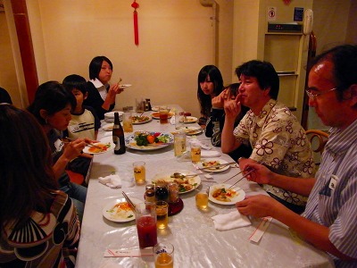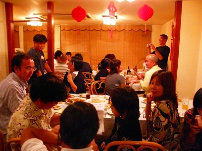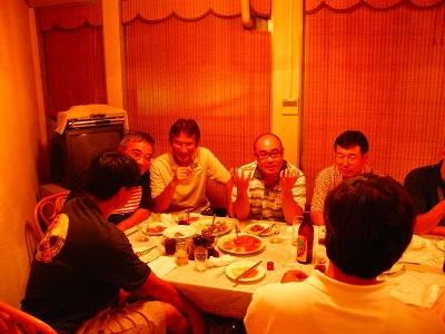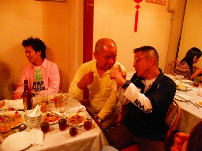 写真2…左に立っているのがUSMRレーシングスクールの営業部長兼アドバイザーを御願いしている新入会員の浩◎選手、右に立っているのはつぶしのご存じゲンさん(今年も紹興酒をビールのようにコップで飲ませつぶした犠牲者2名です。本当に大変でした。面倒を見るのが…)、