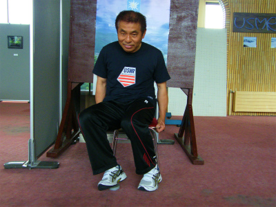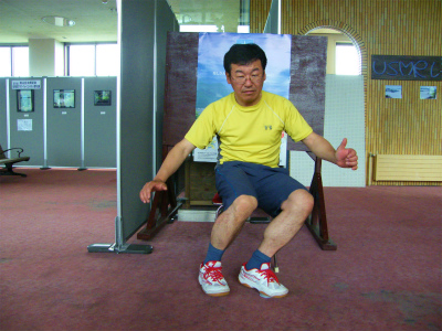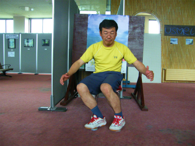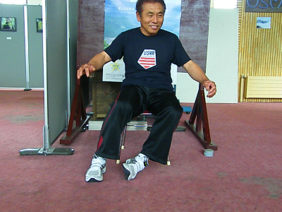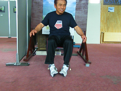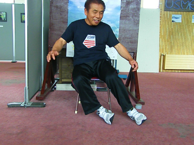 左右の足首をブロックしたままで、脚、膝を左右に動かします。左右が連動して同時操作する事が如何に難しいか?皆さんも練習してみて下さい。ゆっくりが出来たら、ドンドン速くします。そうすると‥ メチャクチャな動きになりますよ。VTRを撮って、スローで見てみましょう。絶対笑えます。特に、盲腸で手術した後の方、肋骨を折っている方にはお薦めです。死ぬぐらい痛く、笑ってくれるでしょう♪